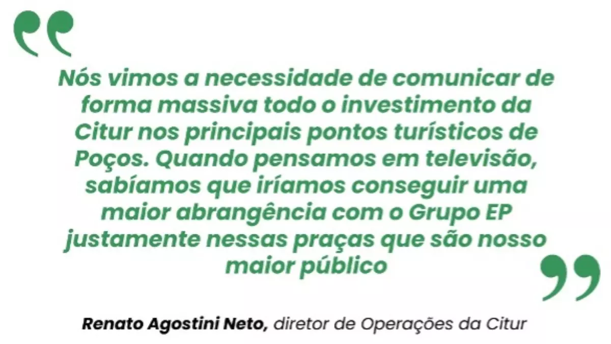 "Hoje, 75% do nosso público turístico é do estado de São Paulo. Também temos de Minas Gerais e Rio de Janeiro, mas estamos bem na divisa com São Paulo, tradicionalmente sempre foi assim, por isso investimos neste público", conta Renato Agostini Neto, diretor de Operações da Citur, sobre a escolha das praças para veicular a campanha da operadora de turismo. "Nós vimos a necessidade de comunicar de forma massiva todo o investimento da Citur nos principais pontos turísticos de Poços. Quando pensamos em televisão, sabíamos que iríamos conseguir uma maior abrangência com o Grupo EP justamente nessas praças que são nosso maior público".