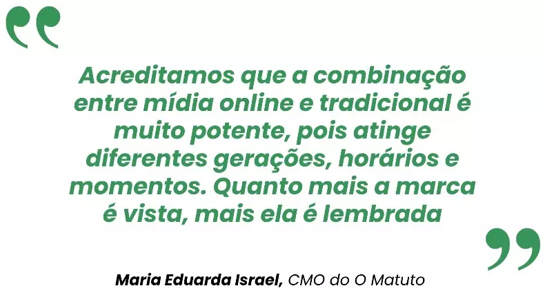 "O Matuto investe em mídia há muitos anos. Já passamos por todas as fases, como jornal, TV e revista. Hoje, num mundo hiperconectado, acreditamos que quanto mais presente a marca estiver, melhor. Não nos limitamos a um único canal e estamos ativos nas redes sociais, na TV e também no out-of-home, com diversos painéis. Acreditamos que a combinação entre mídia online e tradicional é muito potente, pois atinge diferentes gerações, horários e momentos. Quanto mais a marca é vista, mais ela é lembrada", conta Maria Eduarda.